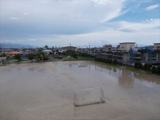 これは、昼休みの様子です。大雨の後、運動場に水がたまっています。