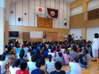 長洲町では英語の研究に取り組んでいて、子どもたちは朝自習や総合的な学習の時間、外国語活動の時間などに楽しく英語を学んでいます。