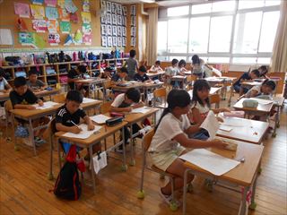 7月11日 投稿日時 : 2017/07/12 学校サイト管理者 11日(火)から5年生は集団宿泊教室で芦北です。昨日、5年生と話をしていると、ペーロンやナイトハイクなどの活動をとても楽しみにしているようでした。決まりを守ったり、友だちと協力したりして、たくさんのことを学び、楽しい思い出をつくって欲しいですね。5年生がいないので、教室はちょっと寂しいです。5年生教室前には自主学習のお手本が掲示してありました。6年生のEタイムの様子です。今日からは各教室で行われています。玄関前です。朝食標語の優秀作品が掲示してあります。玄関前の金魚の水槽です。校長先生が水替えやエサやりなどのお世話をしています。いつもきれいで、金魚も喜んでいるようです。今日の天気です。夏らしい空ですね。明日からは晴天が多いようです。いよいよ夏本番のようです。