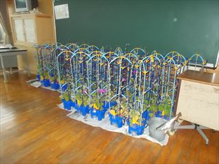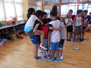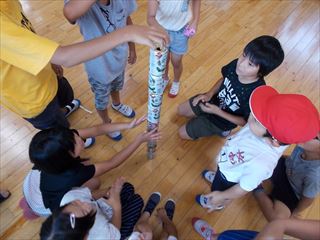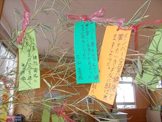 7月4日 投稿日時 : 2017/07/05 学校サイト管理者 4日(火)は朝から台風で雨風が強かったです。その中でも子どもたちは元気に登校していました。1年生のアサガオと2年生のミニトマトは室内に避難です。6年生教室前には、笹竹が設置され、子どもたちが短冊に願いごとを書いていました。2時間目、なかよし学級では、交流会の発表の練習をしていました。業間から3校時は児童集会です。縦割り班に分かれて、いろいろなゲームをして楽しんだり交流したりしました。空き缶を積み上げるゲームです。10個積み上げるのはなかなか大変です。新聞紙の上に何人乗れるか競争です。ボールを前の人から後ろの人に送り、その時間を競っています。企画したのは総務委員です。準備は大変でしたか、みんなが喜んでくれてやりがいがあったようです。休み時間です。女の子たちがトイレのスリッパをきれいに並べてくれていました。昼過ぎには雨風も弱まり、放課後は水泳記録会に向けての練習ができました。最後は自由時間もあり、楽しく遊ぶことができました。