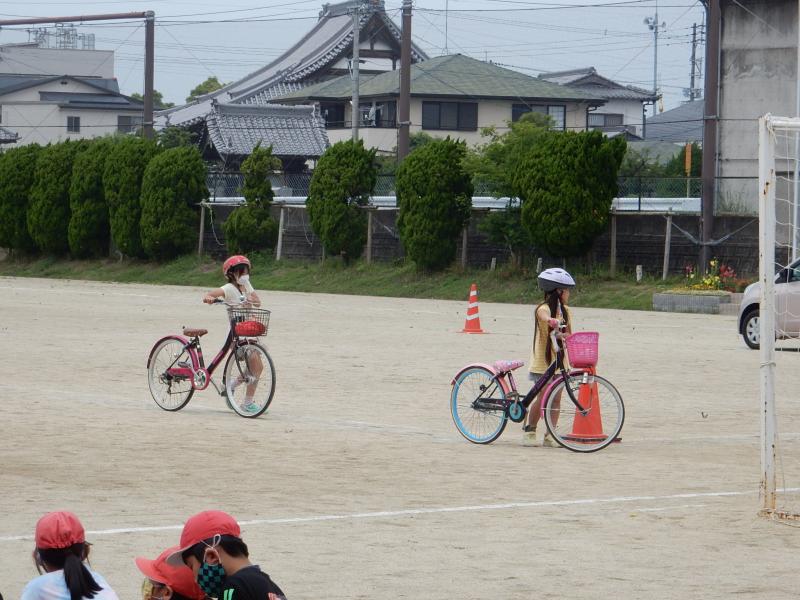 雨天のため延期となっていた交通教室を全学年で行いました。低学年は歩き方を、中学年は自転車の乗り方を運動場で行い、高学年はビデオを見て学びました。