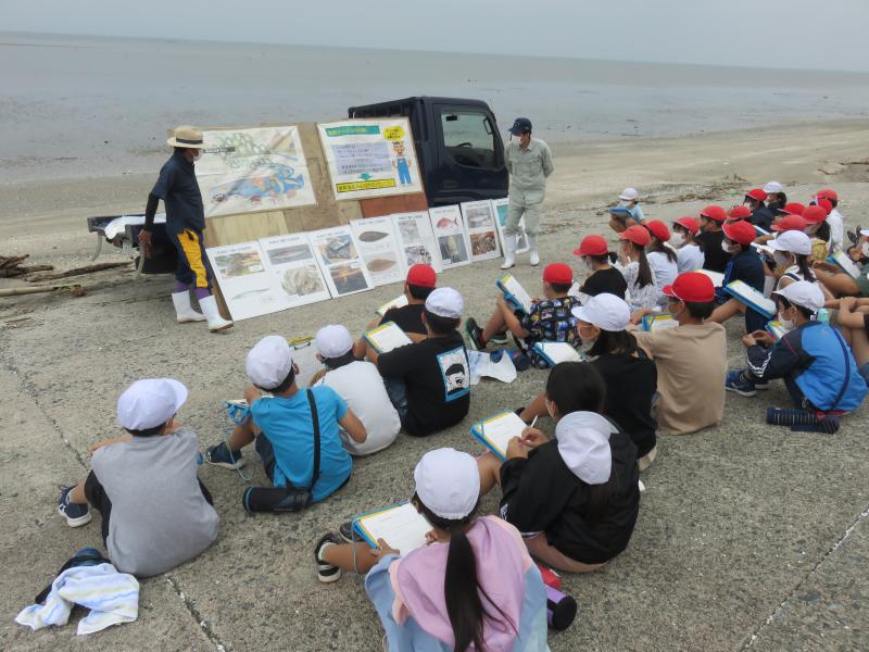5年生が、漁協と町生涯学習課のご協力の下、長洲町の漁業について学び、海岸清掃をしました。