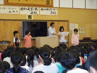 終業式・始業式では、校長先生のお話の後、代表児童による作文発表がありました。