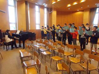 最初に発声練習をした後、いよいよ卒業式の歌「最後のチャイム」の練習です。