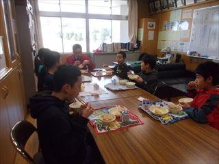 校長室では校長先生が6年生と一緒に給食を食べながら、
