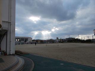 下校後の運動場です。太陽の光が美しく地面を照らしていました。