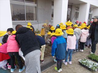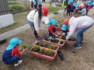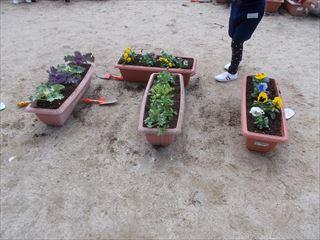 5年生は花壇でなく、子ども園の子どもたちとプランターに花を植えました。