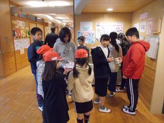 総務委員会の子どもたちが児童玄関前で、赤い羽根共同募金を集めていました。
