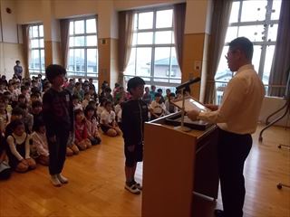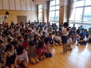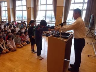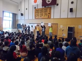 10月23日 投稿日時 : 2018/10/24 学校サイト管理者 10月23日(火)です。本日は児童集会を行いました。集会に先立って、環境ポスターの表彰を行いました。4年生のМ君とHさんが表彰を受けました。児童集会です。今日は図書委員会の発表でした。今までの読書冊数と図書室の使い方のお願いを発表しました。全校では8000冊ほど読むことができたようです。後期も頑張って欲しいですね。その後11月から始まる縦割り掃除について担当の先生からお話がありました。みんなで仲良く協力して掃除することが目的です。図書委員の発表や縦割り班についての感想を発表しています。発表も上手でしたが、聞き方も良かったです。3校時には1年生が秋探しと長洲港見学に出かけました。松ぼっくりも見つけることができ、とても楽しい校外学習だったようです。昼休みには体育館で4年生がコスモス音楽祭の合奏の練習をしていました。とても上手でした。昼からはあいにくの雨となりました。結構な量の雨が降っています。高学年の掲示板です。おすすめの本の掲示がしてありました。とても上手でした。