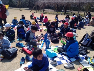 その後の送別遠足も天候にも恵まれ、春の温かい日差しの中、お弁当を食べたり縦割り班遊びや自由遊びをしたりすることができました。