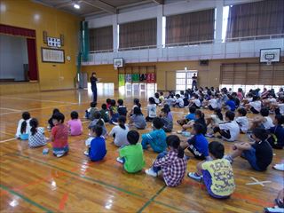 業間は全校で交通係のお話を聞きました。
