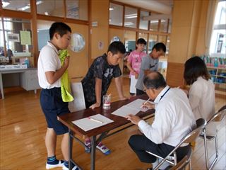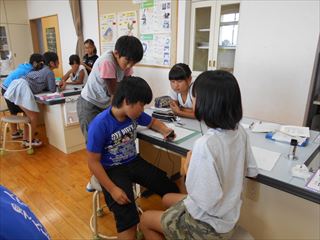歯の指導 投稿日時 : 2017/06/27 学校サイト管理者 26日(月)は中学年の歯みがき指導がありました。長洲町の歯科衛生士の方々が来校され、子どもたちに歯みがきの大切さやブラッシングのやり方についてご指導いただきました。写真は4年生の様子です。指導していただいた歯科衛生士の方々です。鏡を見ながら、丁寧にブラッシングをしています。赤くなっているところは磨き残しがあるところです。磨き残しがあるところはこれから念入りに歯みがきして欲しいですね。磨き残しがある場所を赤で塗ることで、自分の磨き方のくせを知ることができます。みんな真剣に取り組んでいますね。