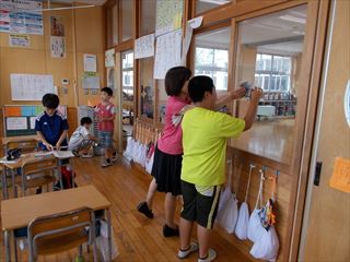 27日の様子 投稿日時 : 2017/06/28 学校サイト管理者 27日(火)の様子です。朝からEタイムを行いました。今回は低学年の様子です。楽しみながら英語に慣れ親しんでいました。業間には今年から始まった美化タイムをしました。各教室や学年の担当花壇などをきれいにしています。作業に一生懸命に取り組む姿は素晴らしいです。4年生は窓ふきをしています。3年生は机や身の回りの整理をしています。他の学年は外で花壇や運動場の草取りをしました。