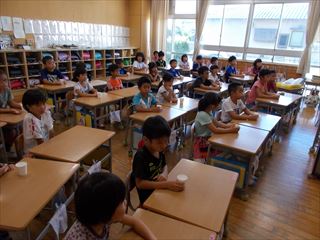 9月1日 投稿日時 : 2017/09/04 学校サイト管理者 1日(金)です。今日は朝からフッ化物洗口を行いました。朝からPTAの方々が準備をして下さいました。いつもありがとうございます。フッ化物洗口は夏休み明け初めてでしたが、みんなとても上手にできていました。これは2年生の様子です。2年生の教室の後ろには、夏休みの工作や自由研究などが掲示されていました。どの作品もとてもよくできていました。1年生のグーグーペタピンの様子です。とても姿勢よく、落ち着いた態度でできていました。理科園ではヘチマの花がたくさん咲いています。雄花が多いのですが、雌花が一輪だけ咲いていました。3年生はホウセンカやヒマワリ、ワタなどの実の観察をしています。よく見て、大きさや色・形などを一生懸命観察カードに書き込んでいました。※今までの出来事は「学校生活」の中に入れています。過去の分を見られたい場合は「学校生活」をご覧ください。