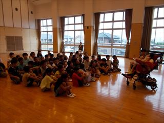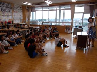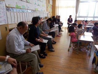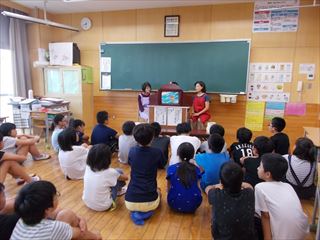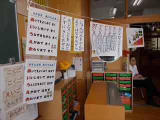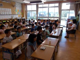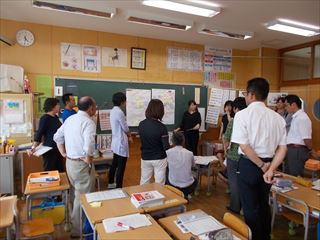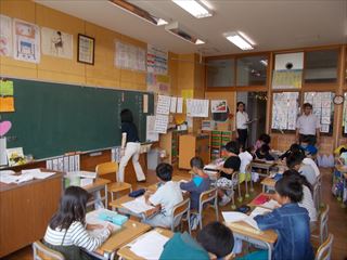 9月25日 投稿日時 : 2017/09/26 学校サイト管理者 25日(月)は朝から「まほうの小箱」のみなさんによる読み聞かせがありました。今回は中学年です。子どもたちも目と耳と心でしっかりお話を聞くことができていました。3年生です。4年1組です。4年2組です。まほうの小箱のみなさん、いつもありがとうございます。2時間目は1年生で授業研究会を実施しました。国語の「おやすみのことを話そう」という単元です。子どもたちは、おやすみの日に経験したことを、順序に気を付けて話したり、大事なことを落とさないようにして聞いたりしていました。先生と一緒にめあてを考えています。姿勢もとても立派です。ノートに目あてを書き込んでいます。少しですが習った漢字も使いました。とっても発表に意欲的な1年生でした。班のみんなに発表したり、お話を聞いたりしています。話したり聞いたりするときに注意することが掲示してあります。授業の最後に自分がよくできたことを発表しました。先生たちも授業を見て気付いたことを指導案に書き込んでいます。自己評価を記入しています。◎が多かったようです。1年生の教室に彼岸花が飾ってありました。子どもたちが持ってきてくれたものでしょう。1年生が発表したり聞いたりする姿はとても立派でした。子どもたちがさらに積極的に、また深く話し合いをするためにどうすればよいか、これからまた研究します。放課後の事後研究会の様子です。とても学びになる授業となりました。