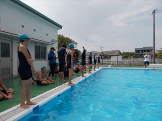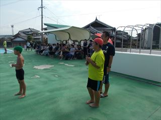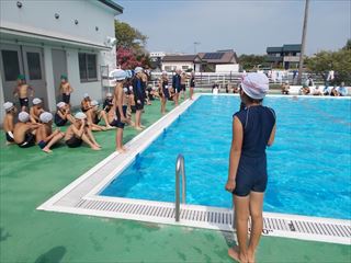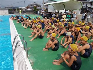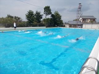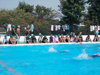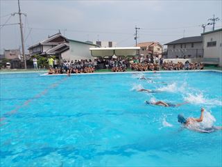 9月7日 投稿日時 : 2017/09/08 学校サイト管理者 6日(水)の校内水泳大会の続きです。昨日は高・中学年をご紹介しましたので、低学年の様子をお伝えします。はじめのあいさつです。姿勢よくきちんとできています。準備運動もとっても上手になりました。手を挙げてスタートの体勢をとっています。ちょっと緊張している子どももいたみたいです。泳ぎ方もこの夏でとっても上手になりました。きっと来年はもっとじょうずになるでしょうね!子どもたちの大好きな水泳学習も今週で終わりとなります。子どもたちの水泳の力がついたのは授業で子どもたちが頑張ったこと、また夏休み中にたくさんプールで泳いだからだと思います。プールでの学習が終わるのはちょっと寂しいですが、夏の間事故もなく楽しく学習ができたことを嬉しく思います。夏休み中のお子さんの見守りなど、保護者の方々にはたくさんご協力いただき、本当にありがとうございました。※今までの出来事は「学校生活」の中に入れています。過去の分を見られたい場合は「学校生活」をご覧ください。