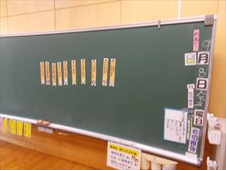 9月29日 投稿日時 : 2017/09/29 学校サイト管理者 28日(木)です。今日は朝から曇りでしたが、午後からは秋らしい気持ちの良い天気となりました。なかよし学級は今日から合同キャンプです。きっと楽しく活動ができていることでしょう。さて、今日は校内のことを紹介します。長洲小学校の1階エレベーター前には掲示板があり、コミュニティスクール担当者が、地域関係のものを整理して掲示しています。的ばかいの道具や長洲嫁入り歌、新山の茨木さんが作って下さった干支の飾り物などがあり、ちょっとした美術館のようです。時々、子どもたちが立ち止まって見ている様子も見かけます。住んでいる長洲町ですが、近すぎて地域のことをよく知らないということもよくあります。ときどき眺めてみると、地域への理解が深まると思います。来校された際は、是非一度ご覧ください。「心の花」の方々からいただいた、貼り絵です。給食前には、生活安全委員会の子どもたちが、靴箱の靴の並べ方が上手な学年を紹介していました。どの委員会も仕事を頑張っています!