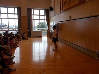 9月20日 投稿日時 : 2017/09/21 学校サイト管理者 20日(水)は業間に環境美化委員会と保健委員会の発表を行いました。環境美化委員会は毎日、長洲小学校に落ちているちりを集めています。発表では、何曜日にちりが多いか、また、どんなちりが多く落ちているかなどについてのクイズと、リサイクルを意識づけるような寸劇があり、楽しく学ぶことができました。クイズの様子です。寸劇もとっても上手でした。発表へのお返しの言葉です。6年生が立派に考えを述べてくれました。発表への意欲もとても高まっています。たくさん手があがっていますね。保健委員会からは、ハンカチ・ティッシュ・爪切りなどの清潔検査の表彰を行いました。1位2年生、2位なかよし学級、3位6年2組でした。2年生の表彰です。なかよし学級です。6年2組です。さすが6年生、みんなのお手本となりました。集会の聞き方も〇でした。次は◎を目指して頑張りましよう!5時間目は5年生が運動場で陸上記録会の練習をしていました。頑張りすぎて、筋肉痛の子どもが多いみたいです。