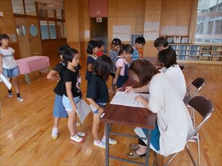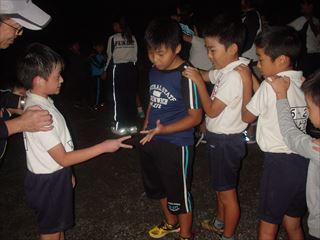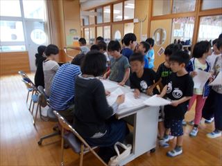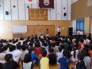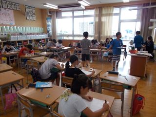 10月11日 投稿日時 : 2017/10/12 学校サイト管理者 11日(水)は業間に体力向上を行いました。内容は前と同じ、縦割り班で行う転がしドッジボールです。先週も行っていますので場所づくりや準備なども上手になってきました。昨日の救給カレーでも紹介しましたが、最近特に高学年の子どもたちがリーダー性を発揮して活動している姿をよく見かけ、頼もしく感じています。後期も長洲小学校を良い方向に引っ張っていって欲しいと思います。秋らしいとても気持ちの良い天候の中、行うことができました。みんな笑顔で楽しく活動できました。3・4時間目には、4年生が金魚のふれ売り体験を行いました。教えてくださる方は、浦島さんと中島さんです。初めに、浦島さんと中島さんの紹介を行った後、中島さんが金魚の歴史について話をしてくださいました。子どもたちもしっかり話を聞き、その後の質問コーナーでも積極的に質問をしていました。次に、浦島さんが実際にふれ売りの様子を見せて下さいました。浦島さんはみなさんが喜んでくれることが生きがいで、良い声を出すよう努力をされてきたそうです。浦島さんがお手本を見せてくださった後、子どもたちもふれ売り体験を行いました。なかなか浦島さんのように上手にはできませんが、みんな一生懸命声を出していました。最後に金魚すくいの体験をしました。上手にすくうことができたでしょうか?
