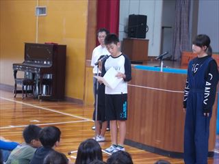 10月6日 投稿日時 : 2017/10/10 学校サイト管理者 6日(金)は前期最後の日です。5時間目に体育館で終業式を行いました。まず、校長先生より三連休の過ごし方について、そして挨拶が上手になったこと、挨拶をすることであいさつをした人が元気になり、結果として人の役に立つこと等の話がありました。長洲小学校の子どもたちは挨拶が上手になってきています。後期も元気な気持ちのよい挨拶を頑張って欲しいと思います。話の聞き方も上手です。その後、2年生と6年生が前期を振り返って発表をしました。しっかり自分を見つめ、そして後期に頑張りたいことを立派に発表できました。2年生です。6年1組です。6年2組です。終業式終了後、読書冊数の表彰を行いました。前期だけで200冊ほど読んでいる児童もおり、みんな驚いていました。表彰された子どもたちをお手本として頑張って欲しいですね。1位の児童です。なんと200冊以上です。2位です。3位です。みんな本当によく頑張りました。今日から三連休です。お休み中の過ごし方については、ご家庭でもご指導いただけると助かります。では充実した三連休をお過ごしください。