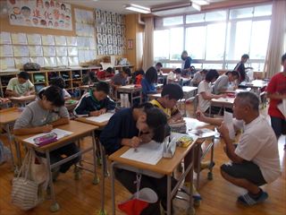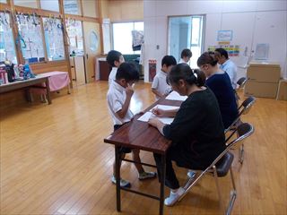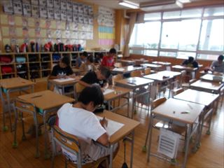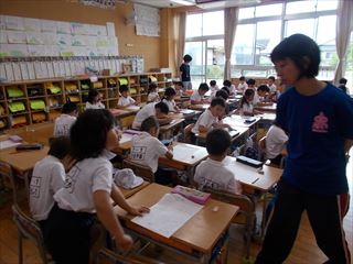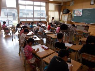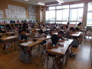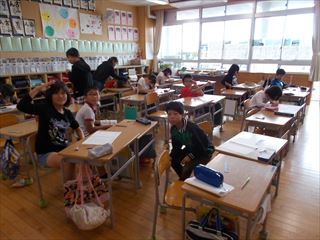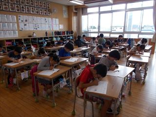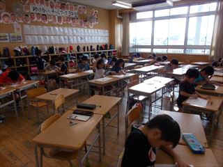 9月29日 投稿日時 : 2017/10/02 学校サイト管理者 29日(金)は朝からフッ化物洗口を行いました。PTAの方々がいつも準備をして下さっています。1年生教室ではフッ化物洗口の準備をしていました。今は黙想をして、心を落ち着けています。1時間目の6年生の理科の時間です。植物が二酸化炭素を吸収して酸素を出すことを実験で確かめています。業間はチャレンジタイムを行いました。たくさんの保護者の方々が丸付けを手伝って下さいました。子どもたちもおうちの方に丸を付けてもらってうれしそうでした。ご協力ありがとうございました。チャレンジタイムの初めの挨拶です。今回は5年生の写真です。5年生は公約数の問題に取り組みました。1組です。2組です。みんな真剣に取り組んでいますね。最後にきちんとお礼のあいさつを言うことができました。3年生のあいさつの写真です。丸付けしていただくことを当たり前と思うのではなく、感謝の気持ちを持つことが大切ですね。