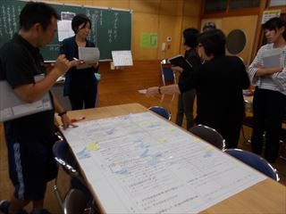 10月16日 投稿日時 : 2017/10/17 学校サイト管理者 16日(月)は校内研修の様子をお知らせします。今回の校内研修は、4年生の国語の「アップとルーズで伝える」の事前研でした。長洲小学校の事前研は模擬授業形式で行います。まず、授業する先生から授業についての説明を行い、本番と同じように授業を行います。他の先生は子どもたちとして参加します。そして、授業を行ったみて成果や課題を出し合います。模擬授業の様子です。今回はアップとルーズという反対のことを説明している段落から、対比の関係を読み取らせ、その良さに気付かせることが目的です。広用紙に指導案を拡大したものを準備し、成果・課題、気づいたことなどを記入していきます。私なら、このようにしますということを説明しています。たくさんの建設的な意見が交わされました。事前研を活かして、子どもたちが楽しく分かりやすく学ぶことができる授業をつくっていきます。