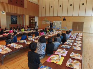本日は長洲保育所、幼稚園と本校5年生との交流給食も行いました。