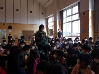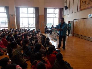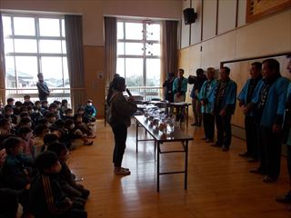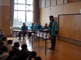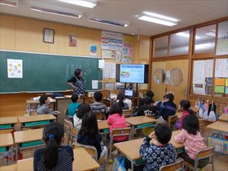 次に、町の農林水産課の松岡さんに、この出前講座の目的について説明していただきました。目的はながす羽衣琉金について地域の子どもたちに知ってもらいたいことと、全国の人たちに好きになってもらうため、まず、長洲町の子どもたちに好きになってもらうためです。