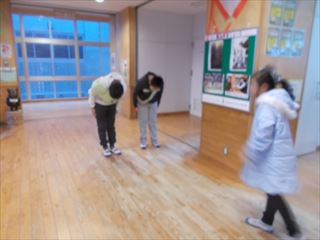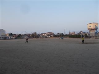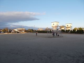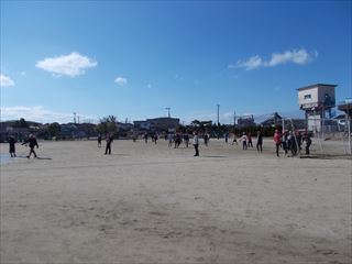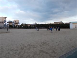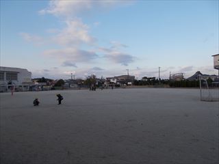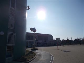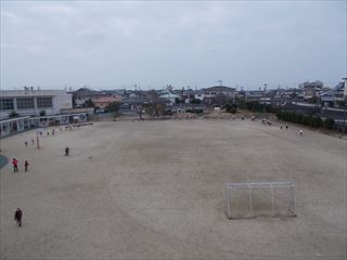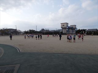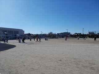 昼休みです。風は冷たかったですが、日光が当たっているところは暖かく感じました。たくさんの子どもたちが運動場で遊んでいます。