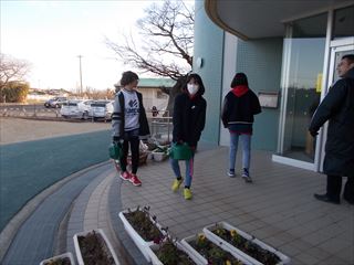 寒い中、栽培委員の子どもたちが、花の水やりをしていました。