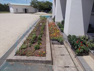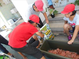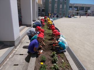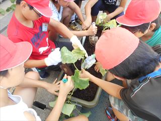 7月11日 投稿日時 : 2018/07/12 学校サイト管理者 7月11日(水)です。今日も朝からEタイムを行いました。水曜日はALT・NT・英語専科の先生が来られ、授業につながる学習を中心に行います。好きな動物の名前を動作を取り入れながら、楽しく学習していました。これからは昨日の様子をお伝えします。10日の4時間目に6年生が栽培担当の先生に教えてもらながら、グリーンカーテン作りを行いました。植え方の説明を聞いています。グリーンカーテンを作りためにはかなり大きなプランターが必要だそうです。水はけを良くし、土が漏れないようにするために植木鉢のかけらを底に敷き詰めています。植える苗はきゅうりです。温度も下げてくれるし、食べられるので一石二鳥ですね。みんなで協力して苗を植えています。さすが6年生、協力して手際よく植えることができていたようです。夏の職員室はかなり暑くなるので大変助かります。グリーンカーテンが早く大きく成長して欲しいです。6年生ありがとうございました。