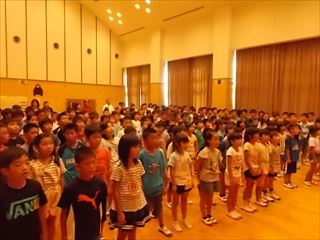 8月27日 投稿日時 : 2018/08/28 学校サイト管理者 8月27日(月)です。今日から前期後半の始まりです。2時間目に大掃除と全校集会を行いました。集会に先立ち、転入生の紹介を行いました。今日から環境が変わり、慣れるまで少し時間がかかるかもしれませんが、みんなで支えていきます。安心して楽しく学校に来て下さいね。校長先生のお話です。2つお話をされました。一つ目はボランティアについて、もう一つは挨拶についてです。スーパーボランティアの尾畠春夫さんの話題から、ちょっとでいいので、自分でできるボランティアを頑張ろうと話されました。二つ目は、立ち止まって挨拶です。ちょっとしたことですが相手を大切にする心が育ちます。今日の集会の入場や話の聞き方もとても素晴らしく、子どもたちのやる気を感じることができました。校歌も一生懸命歌っています。本日安全担当から、飛び出しや危険予知などについての話もしました。本日と明日は午前中授業で午後はお家で過ごすことになります。下校後の過ごし方について、ご家庭でも御指導いただけると助かります。階段の踊り場の掲示板には、心に響く言葉の掲示がしてあります。言葉の意味をかみしめながら、前期後半を子どもたちと過ごしていきたいと思います。