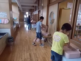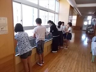 8月30日 投稿日時 : 2018/08/31 学校サイト管理者 8月30日(木)です。早いもので、8月もあと1日となりました。今日は朝から雷が鳴り、雨が降りそうな天気となりました。朝から運動場でサッカーをしている子どもたちがいましたが、安全のため、校舎内に入るよう放送しました。1時間目に水泳を予定していた学年もありましたが、安全のため中止としました。3時間目からは天候が回復したので水泳学習を実施することができました。今日は夏休み明け最初の委員会活動を行いました。これからの活動の予定を立てたり、今までの反省を活かした活動の見直しを行ったりしました。図書委員会です。総務委員会です。放送委員会です。体育委員会です。給食委員会です。お盆の消毒をしていました。生活安全委員会です。環境委員会です。健康委員会です。学校の活動とは違いますが、金魚フレンズでは皿回しなどの楽しい活動が行われていました。前期後半が始まってやがて一週間経ちます。子どもたちも少し疲れが見られるようです。早めに就寝したり、規則正しい生活をしたりして、体調を整えるようご家庭でもご指導をよろしくお願いします。