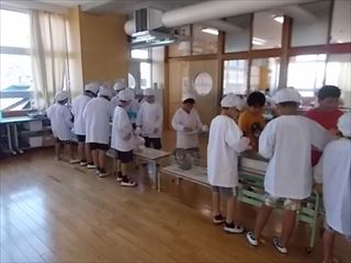 4年生がセルフ方式で素早く上手に配膳をしていました。