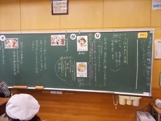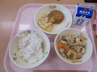 今日の給食です。ハンバーグのようなものは豆腐で作ってあるそうです。