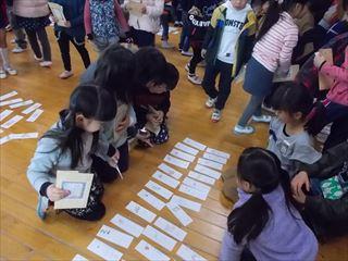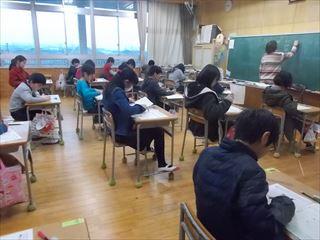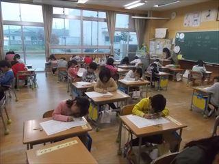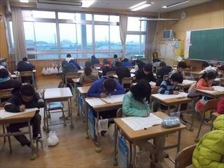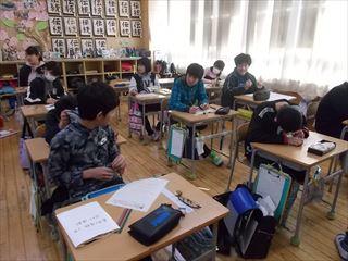 検査が終わると5年生が問題と答案を協力して名簿順に並べていました。