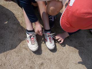 友だちの靴ひもを結んでいる優しい子どもを見かけました。