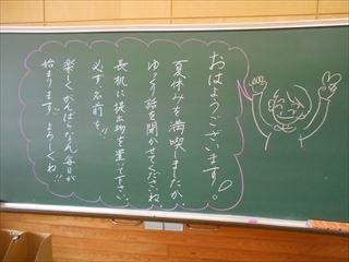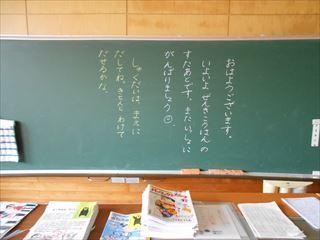 教室の黒板には子どもたちを迎える言葉が書いてありました。