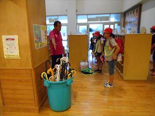 傘を持ってきていなかった子どもたちに、校長先生が傘を準備してくださいました。