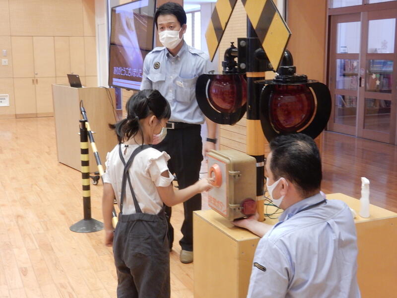 JR熊本駅より2名の安全教育担当者を招いて、踏切について説明を聞いたり、遮断機の機能について学びました。