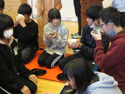 約2時間かかりました。終了後は、数名のお母さん方が寒い中作っていただいた"ぜんざい”を