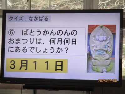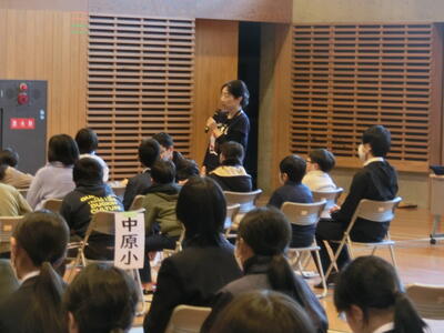 2月6日(木)、寒さの厳しい中ではありましたが、3小の2年生が中原小学校に集合し、合同学習会が開かれました。中原校区の史跡巡りをする予定でしたが、あいにくの寒波と前日までの雪の影響で路面凍結もありましたので、校舎内での活動となりました。最初に、教育委員会の井芹先生(元中原小校長)から、楽しいクイズ形式で中原の史跡についてお話をしていただきました。その後、交流会をし、親睦を深めることのできた時間となりました。他の小学校から来てもらい、中原小の2年生もたいへん喜んでいました。