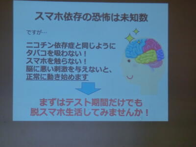 11月22日(金)、南小国中学校において、合同で薬物乱用防止教室が行われました。1週間前に、町の薬剤師さんに、「依存」の怖さなどを、事前に指導していただいておりましたので、今回も高い意識をもって臨むことができました。今回は、「タバコが体に与える影響など」について、講師の先生がくわしくお話をしてくださいました。たばこに含まれる有害物質は、主流煙よりも副流煙に多く含まれることなども知ることができました。「ニコチンによる依存」で、気分がイライラしたり、落ち着かなかったりなど、良いことは一つもないことも学びました。