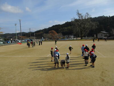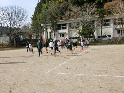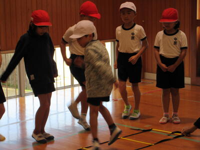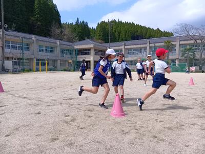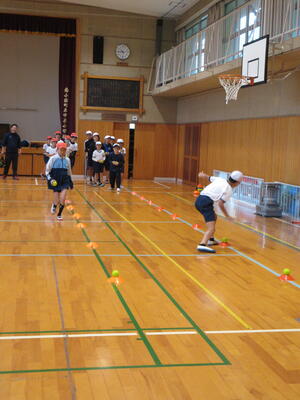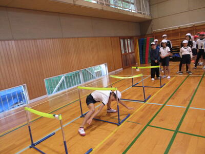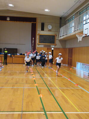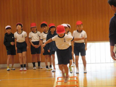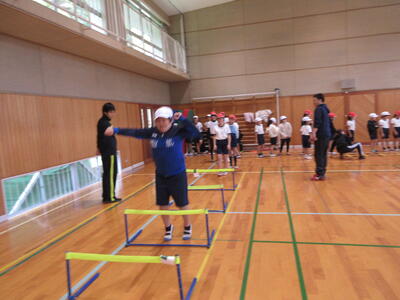 11月29日(金)、本校の保護者で、小国で陸上の指導者をされている古賀さんにGT(ゲストティチャー)で来ていただき、持久走大会に向けた陸上の指導していただきました。始めに古賀さんが「持久走はきついなと思う人!」と聞かれたとき、多くの子どもたちが手を挙げました。そんな子どもたちの予想を覆すかのように、マーカーやミニボールを使ったリレー、大・中・小のハードルを使ったジャンプやくぐり、ラダーを使った様々なステップなどなど、ともかくあっという間の60分間でした。子どもたちは、いい汗をかきながら「楽しかったぁ」と話していました。体育の授業の前のウォーミングアップや導入でも生かしていきたいと、担任の先生方の意欲にも火がついていました。