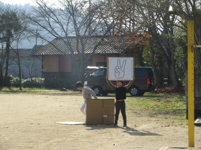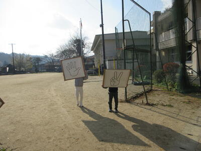 12月の保健目標は「感染症の予防をしよう!」です。そこで、保健給食委員会の子どもたちが、積極的に活動をしています。寒さを忘れて楽しく感染症対策ができるようにということで、『じゃんけん』方式で換気をすることになりました。委員長さんの声に合わせ、運動場で保健委員さんが出す巨大パネルに向かって、教室の子どもたちが窓を全開にしてじゃんけんをします。数分程度ではありますが、生き生きと笑顔で換気をしていました。寒さが厳しくなってきますが、子どもたちのアイデアとがんばりで寒さも吹き飛びます!!