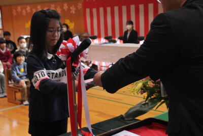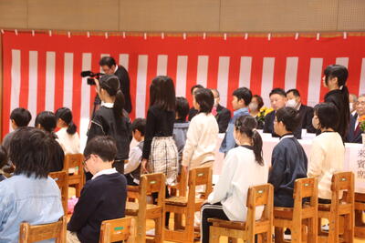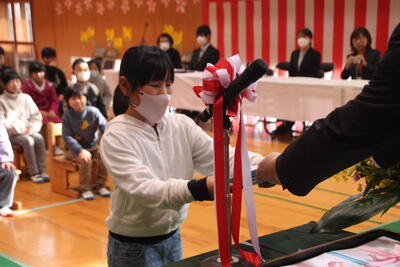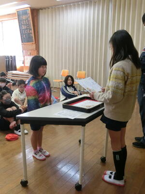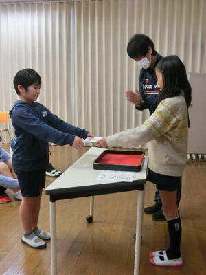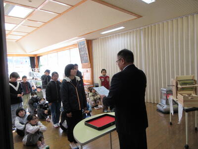 最後に、6年生が「赤い羽根共同募金」の呼びかけを行いました。お年玉の一部でもいいので、ご協力をお願いします。1月10日まで受け付けます。どうぞよろしくお願いいたします。