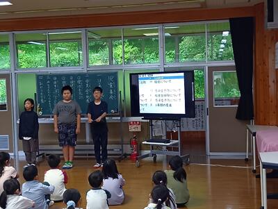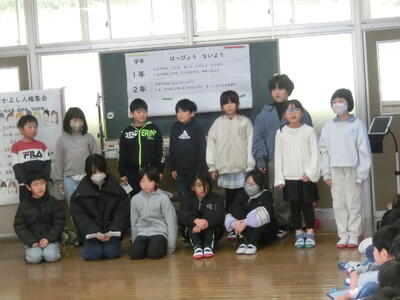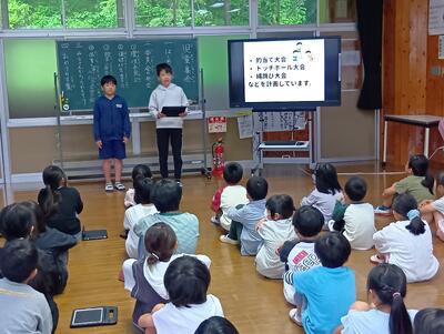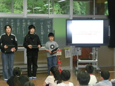 6月9日(月)に児童集会で、児童会の各委員会から、今年度の活動目標と活動計画についての説明がありました。本校には、4つの委員会があり、より良い学校にするため活動しています。今回の集会で、自分たちや学校の課題を考え、その課題を解決するためには、どのような委員会活動にするかなど、しっかりと提案してくれました。