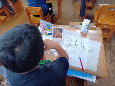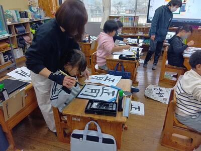 1月15日(水)は、今年初めての書写があり、集中した「書き初め」の時間となりました。前回同様、河津さんにご指導いただきながら、一字一字をじっくり書いていました。河津さんから、「よくなったね~」「いいよ~」と褒めてもらい、嬉しそうでした。「もっと書きたいです」と言い出す子どももおり、意欲的な姿が見られました。
