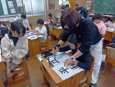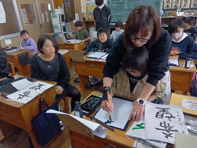 12月18日(水)、本校の保護者で、地域で書道を教えておられる河津さんに、GT(ゲストティチャー)として「書き方」(書写)の指導をしていただきました。3~6年生は毛筆、1・2年生は硬筆と、全学年教えていただきました。文字を書くときには、必ず止める所でしっかり止めることが大切です。河津さんは、「とまるくん」というキャラクターで、子どもたちに分かりやすく教えてくださいました。子どもたちは、「おっ、良くなったね~」「いいよ~!」と花丸で褒めてもらい、短時間でめきめきと上達していました。子どもたちも達成感たっぷりの時間となりました。今後の書写指導の参考にさせていただきたいと思います。師走のお忙しい中、河津さん、ご指導ありがとうございました!