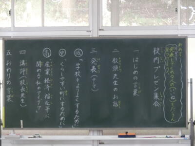 2月1日(土)に開催される「南小国町のプレゼンテーション大会」に向け、1月24日(金)に校内プレゼン集会が行われました。中原小学校の代表として出場する3名の子どもたちが、各学年のテーマのもと、全校児童の前で発表をし、その後、聞いていた子どもたちが、さまざまな気づき(いいね!)を返していきました。代表の人は、たいへん緊張していましたが、しっかり自分の考えをまとめ、伝えようと工夫をしていたので、聞いている人も一生懸命に聞いていました。3名の子どもたちは、みんなからもらった気づきを参考にしながら、さらにバージョンアップさせて本番に臨みます。本番の発表が楽しみになってきました。